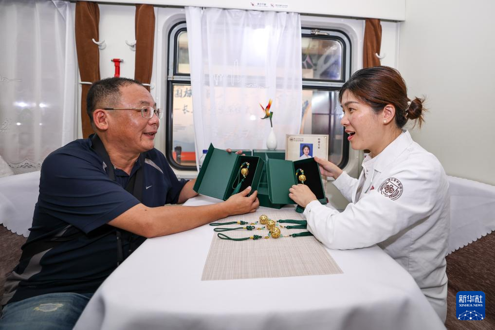 5月19日,浙江省西醫院大夫(右)在Y476/7次“長三角號”援疆銀包養行情發游玩專列上向搭客贈予噴鼻囊掛件。